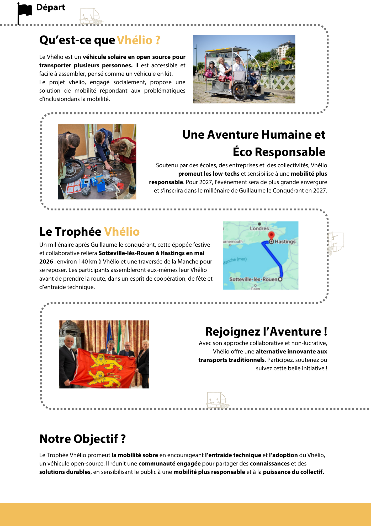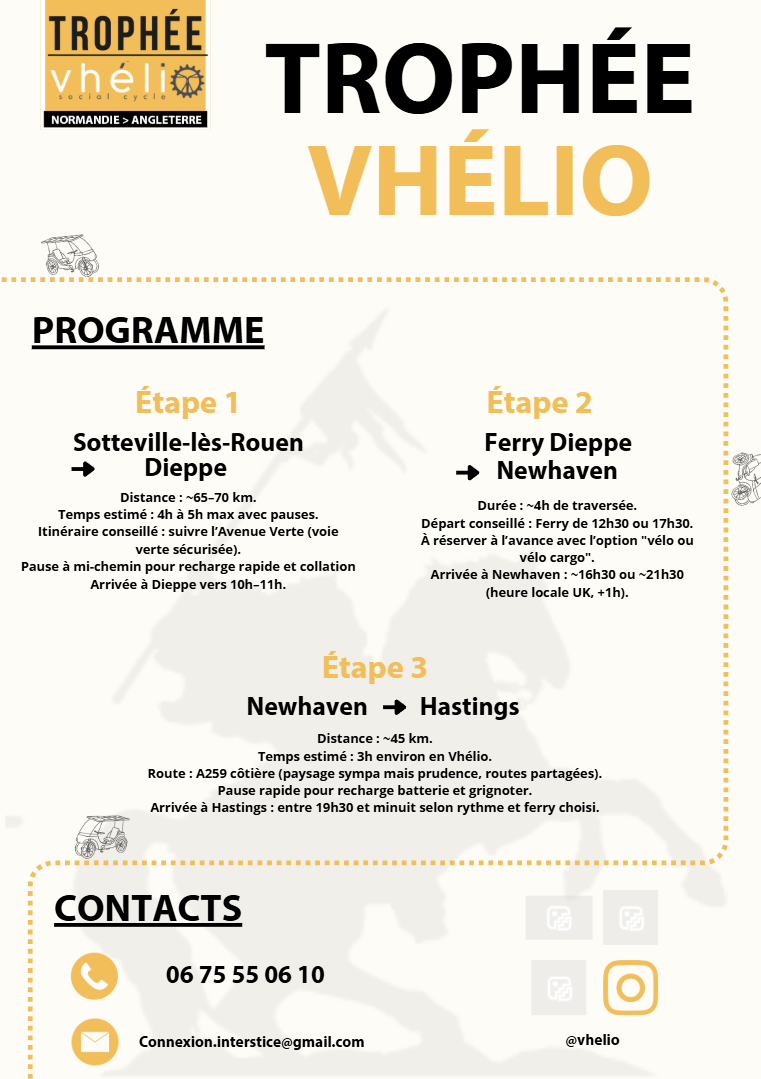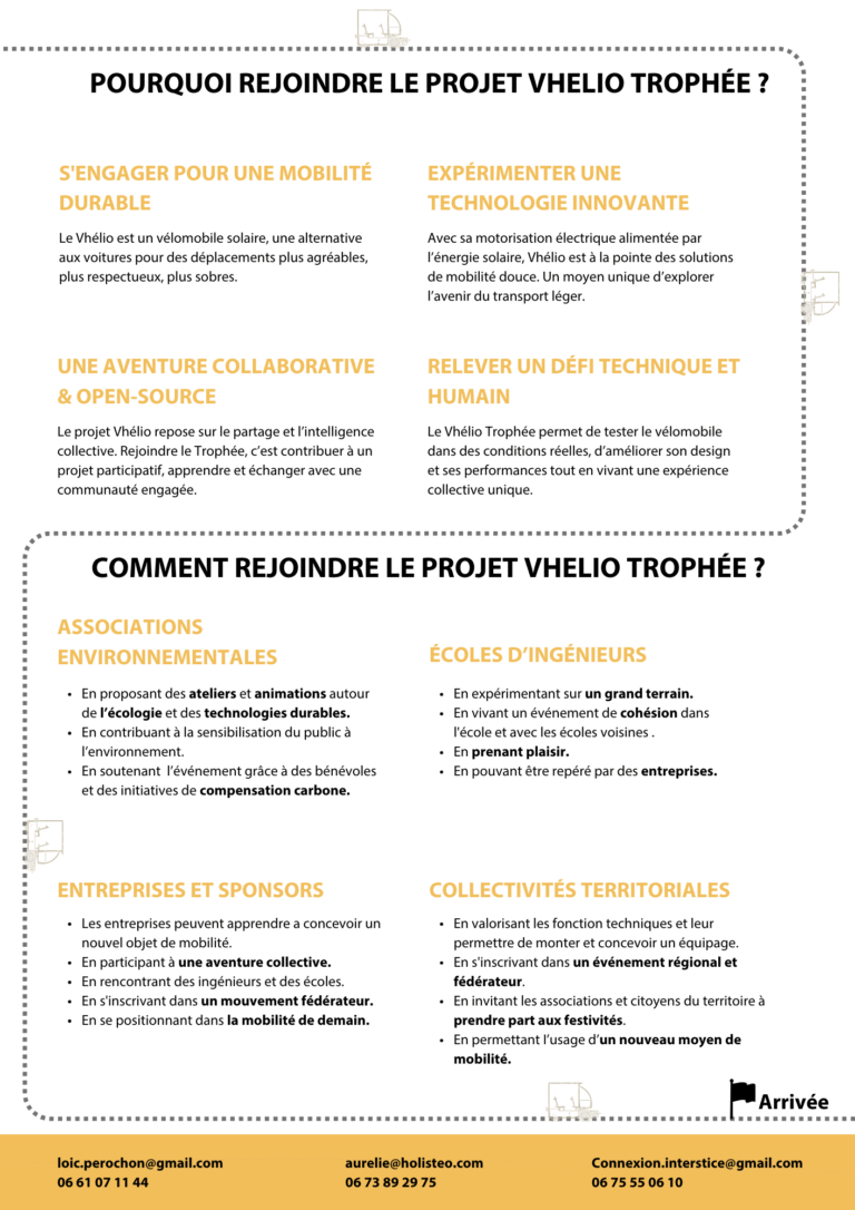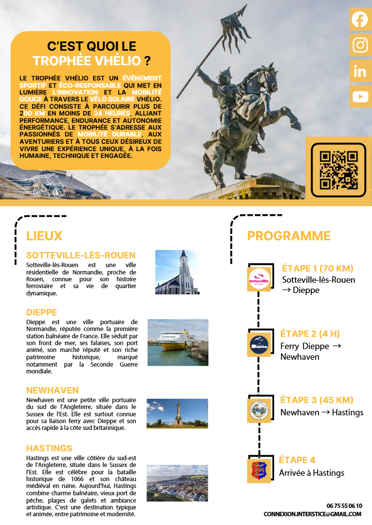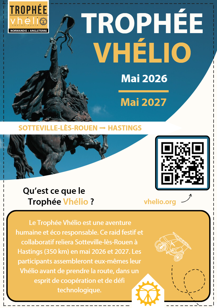 Durant mon alternance à la Normandie Web Project, j’ai été contacté par une association développant le projet Vhélio, un véhicule solaire à assistance électrique conçu pour offrir une alternative écologique aux déplacements du quotidien. J’ai été missionné pour mettre en avant leur futur événement, le Trophée Vhélio : un parcours reliant Sotteville-lès-Rouen à Hastings, incluant le montage des véhicules au point de départ. Nous avons alors réalisé un site Internet avec WordPress, un dossier de presse, un kit de communication ainsi que des flyers pour promouvoir l’événement.